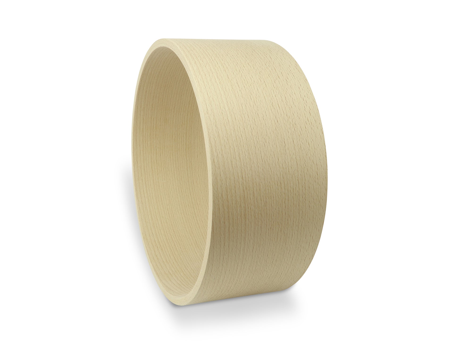 Moderner 14" x 5,5" Buche/Beech Solid-Ply (Steam Bent) Snarekessel aus europäischer Buche mit einer Wandstärke von 10 mm. Nach dem verkleben werden die Vollholzkessel mit einer präzisions CNC-Fräse perfekt rund auf eine Kesselstärke von 10 mm gefräst. Die hochwertig gebogenen Vollholzkessel kommen dank modernster Fertigungstechniken ohne die bekannten Verstärkungsringe aus. Dies ermöglicht einen offeneren Klangcharakter, als Schlagzeugkessel mit Verstärkungsringen (Re-Rings) und besitzen außerdem ein etwas längeres Sustain.