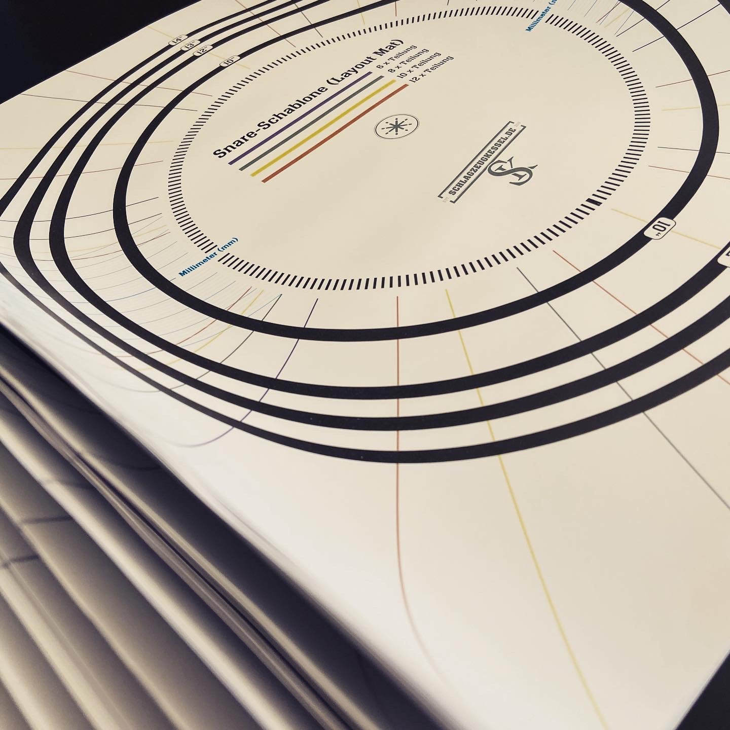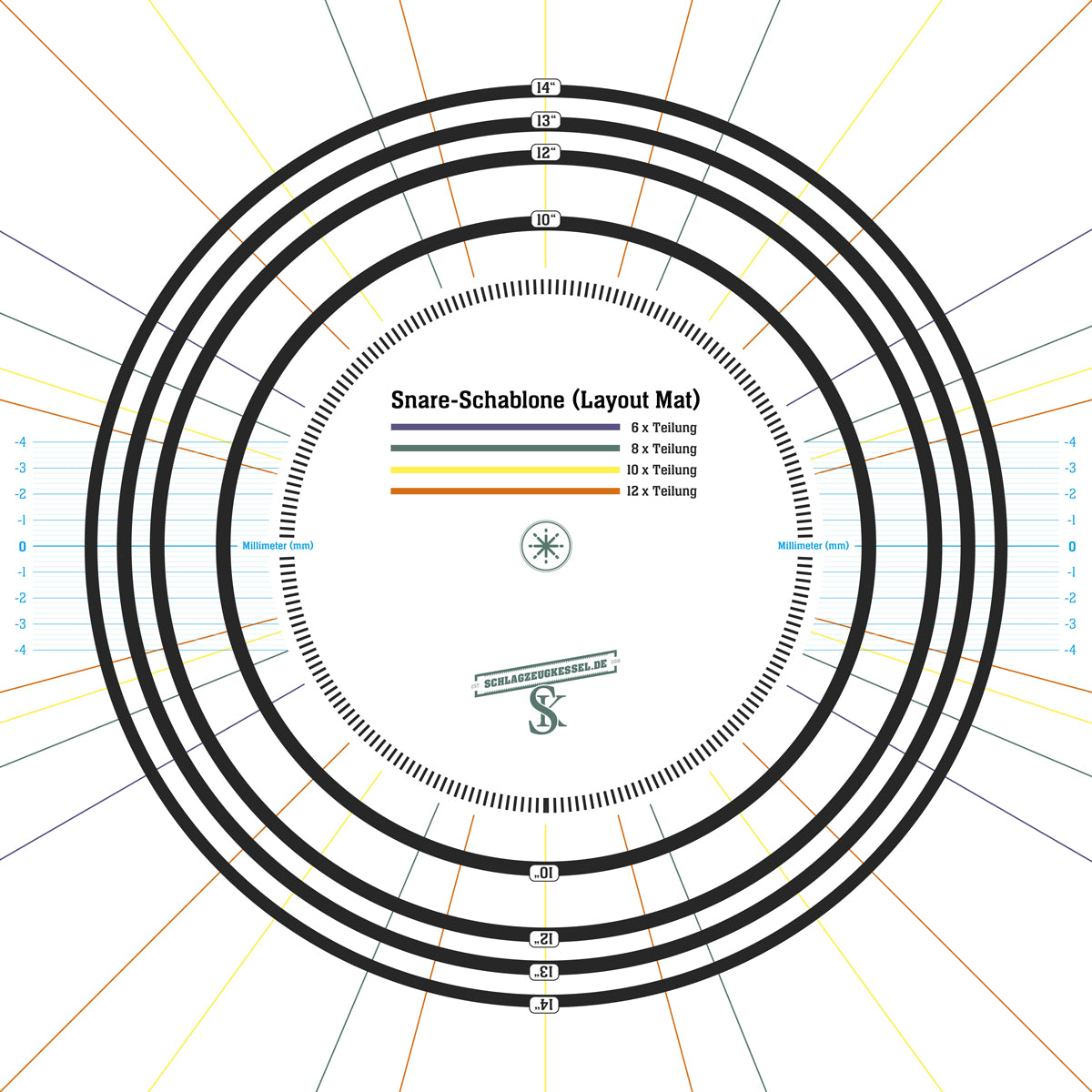 Snare-Drum Layout-Mat auf Papier im Format 42 cm x 42 cm. Einfaches Anzeichnen der Snare Drum Spannböckchen/Lugs und des Snarebed mit Millimeterangabe (nicht wie bei Layoutmatten aus den USA in Zoll).